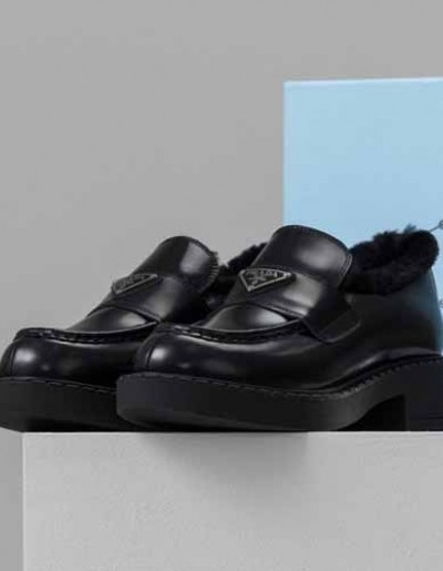 프라다 로고 브러쉬드 레더 로퍼 블랙 퍼 시어링